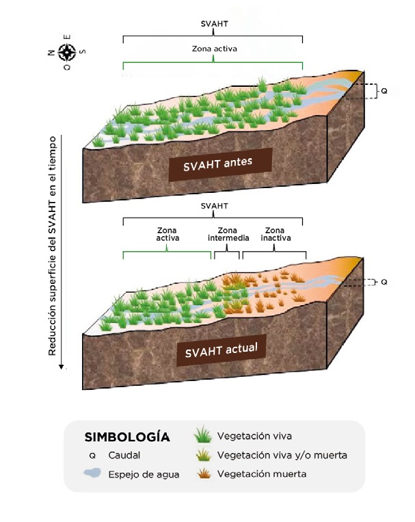El modelo general de la dinámica de muerte del SVAHT del Salar de Pedernales muestra cómo habría comenzado a reducirse la superficie de vegetación, dando lugar a la formación de tres zonas: zona inactiva, zona intermedia y zona activa. Los resultados obtenidos revelan que la disminución de la superficie de vegetación habría sido un proceso gradual, donde la muerte de las plantas habría comenzado aproximadamente en el año 1951 en la zona inactiva, y alrededor del año 1959 en la zona intermedia. Este proceso habría durado alrededor de 71,5 años en la zona inactiva y 62,9 años en la zona Intermedia, estabilizándose entre los años 2010 y 2011. Las mayores edades de muerte de plantas en la zona estudiada se observan en las plantas del extremo sur de la zona inactiva, lo que indica que la disminución de la superficie del SVAHT habría ocurrido inicialmente desde el extremo sur hacia el norte.