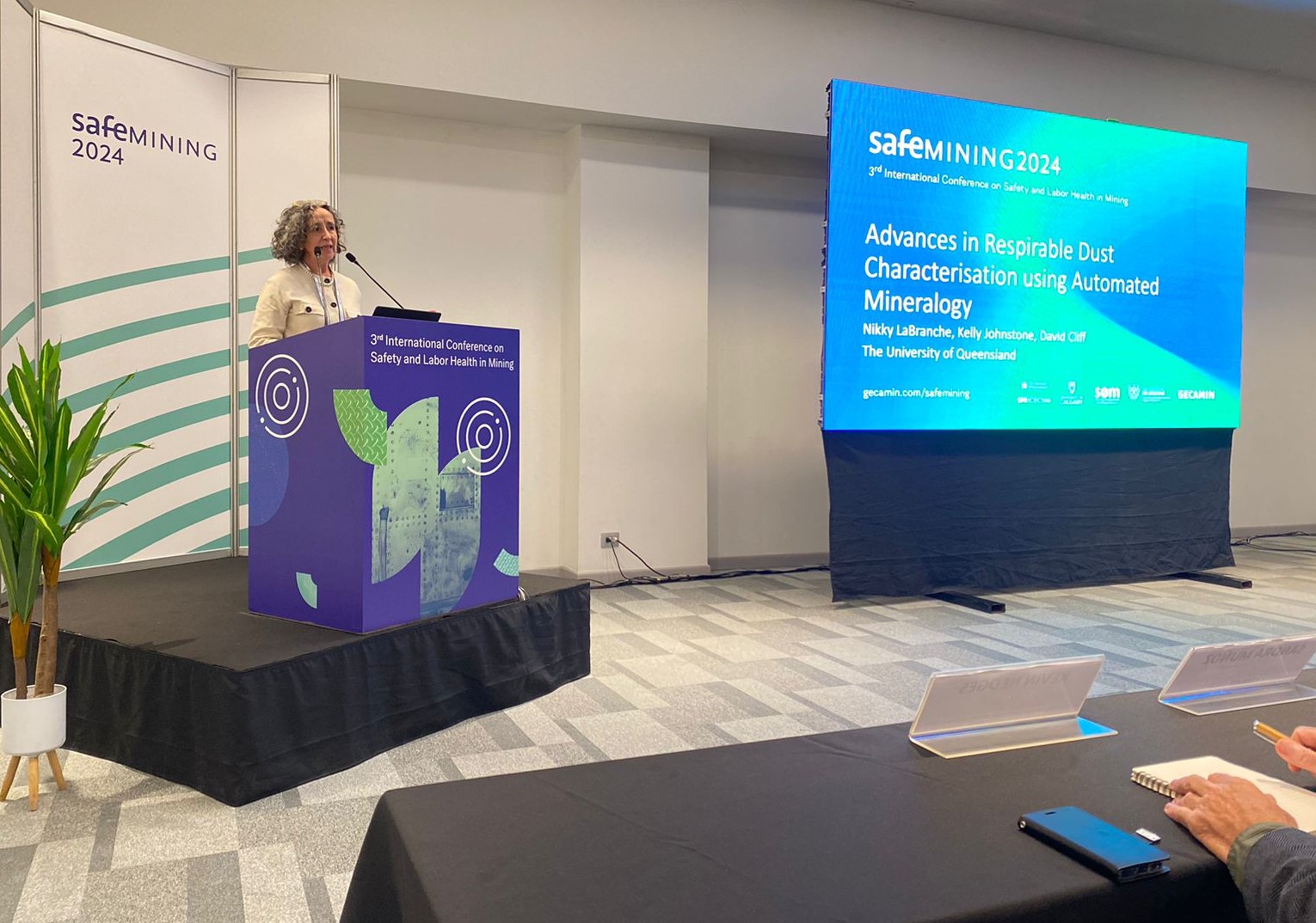Furthermore, the general manager of SMI-ICE-Chile, Francisca Rivero, had to take on the no small challenge of presenting the research: “Advances in respirable dust characterization using automated mineralogy”, by researcher Nikky La Branche, from the Sustainable Minerals Institute, who, for reasons of force majeure, could not be present at the conference.